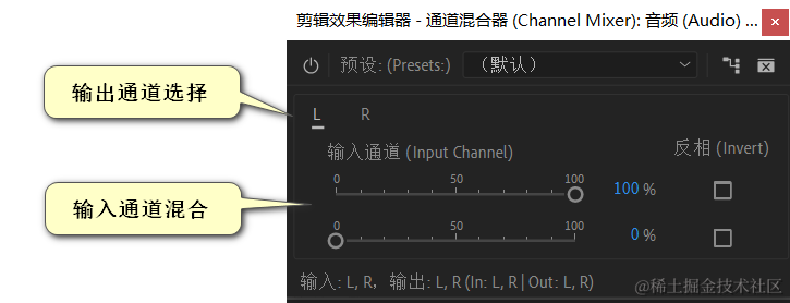 通道混合器效果可改变立体声或环绕声道的平衡。可以更改声音的外观位置、校正不匹配的电平或解决相位问题。\