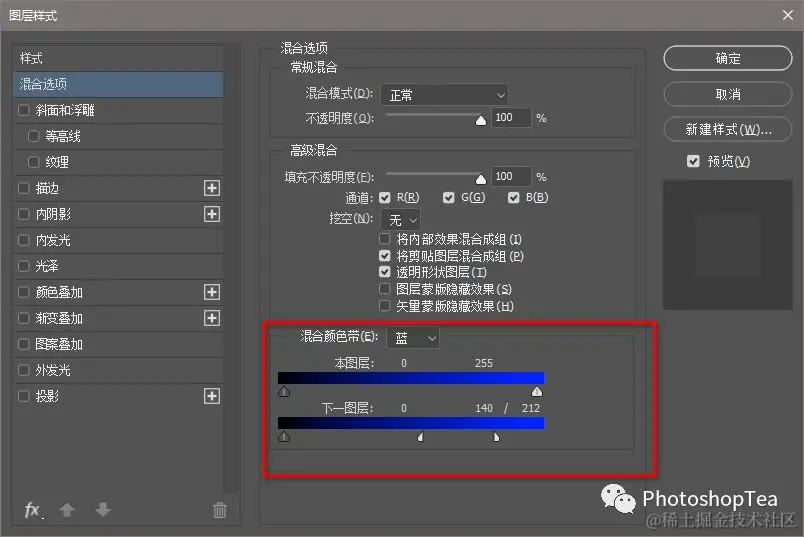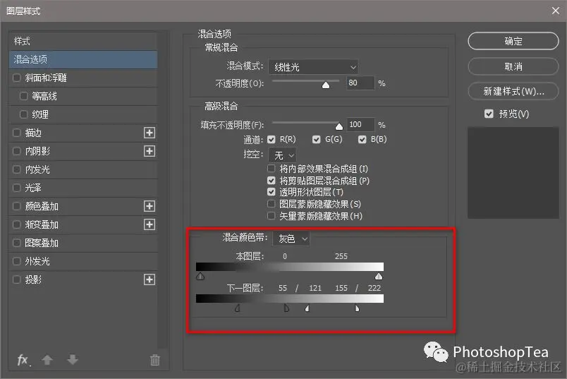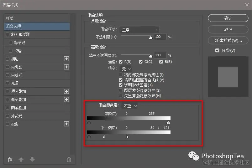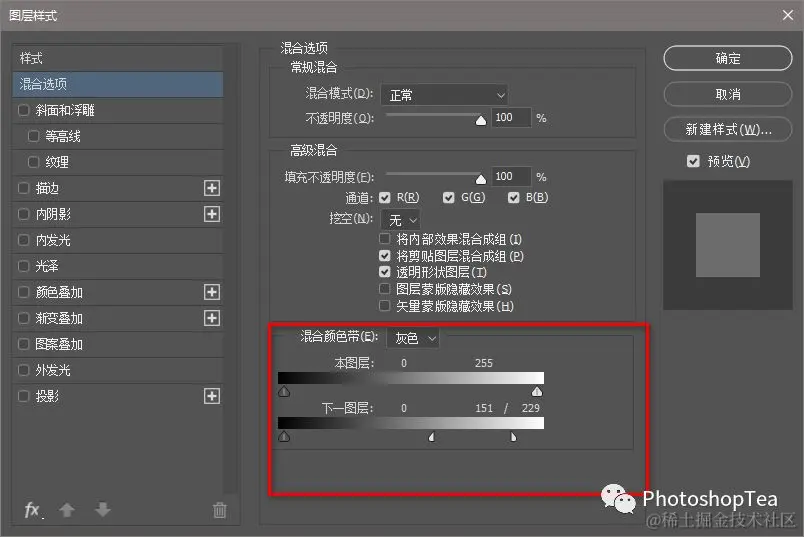或者,新建黑色或白色的填充图层,然后调整混合颜色带,以决定影响的范围和程度。