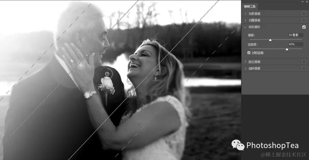 移轴模糊也称作倾斜模糊,此特殊的模糊效果会定义清晰区域,然后在边缘处逐渐变得模糊。常用于模拟移轴镜头或微距拍摄的照片。