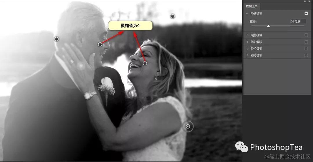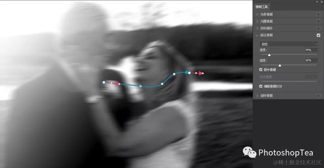模糊画廊里的所有模糊工具的本质是:为图像应用了一个隐藏的蒙版,黑色对应未被模糊的部分,白色对应要模糊的区域。