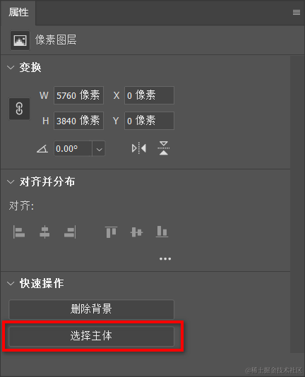 PS 2020版以后,选择主体命令也出现在了像素图层的属性面板里。\