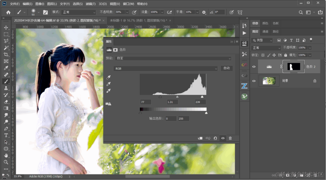 (2)新建色阶调整图层,选区自动转换为图层蒙版。通过调整色阶滑块,让主体或最想关注的局部呈现最丰富的层次关系。
