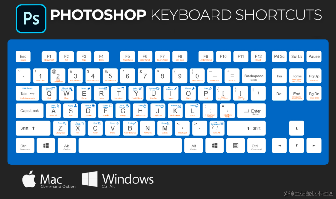 说明:为避免篇幅过大,本文快捷键是基于Windows系统下Photoshop 2020版本的。Mac系统下的快捷键可按以下方式进行对应:Ctrl→Command,Alt→Option。有不能对应的,本文会给出说明。部分项目附加英文是为了方便记忆快捷键。