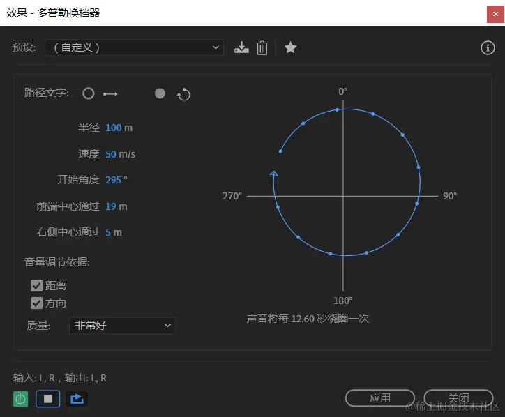 提示:与Au效果中的许多图示不同,“多普勒频移”图示是非交互性的:无法直接对图示进行操作。相反,当调整效果的参数时,图示会发生更改。