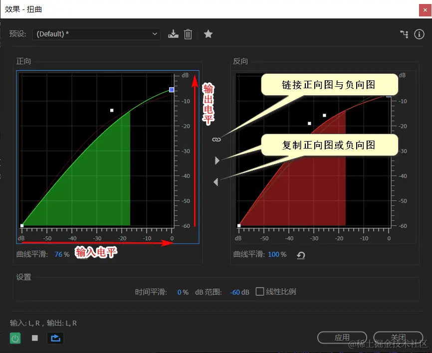 为正负采样值分别指定扭曲曲线。默认对角线描述不扭曲信号,输入和输出值之间为一对一关系。