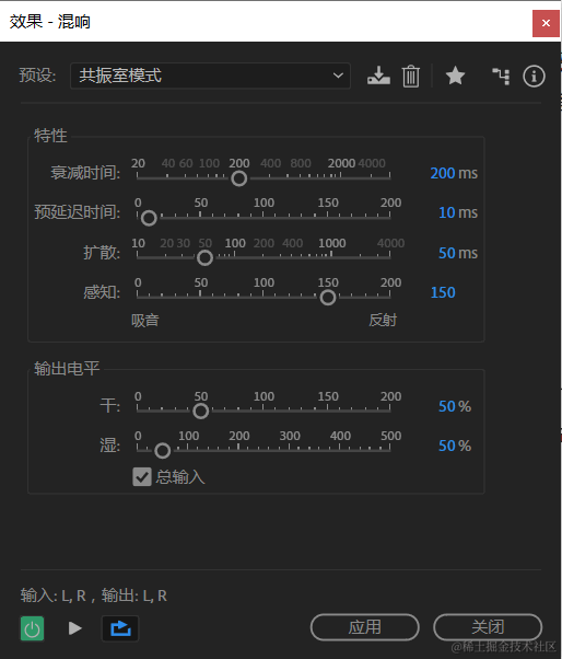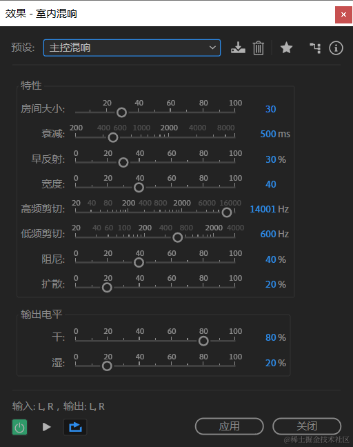 房间混响 Room:混响时间较短,具有一定的空间距离感,没有边界感。适当使用,能增加声音的密度及融合度,过量则易导致声音浑浊。