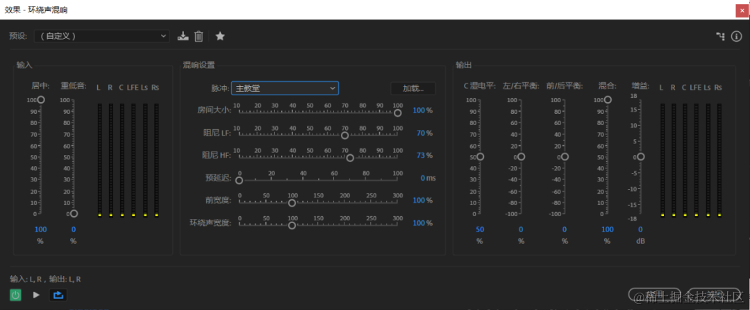 控制前后扬声器的左右平衡。设置为100仅对左声道输出混响,设置为-100 仅对右声道输出混响。