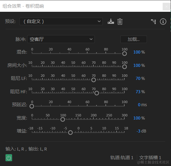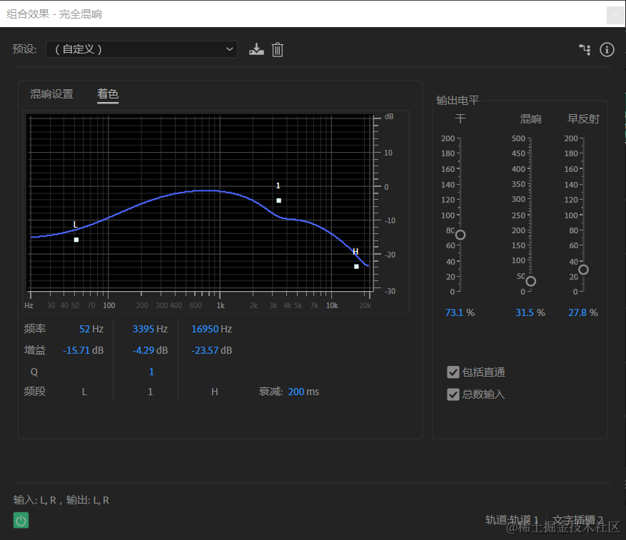 相对于混响效果,完全混响效果提供更多选项和更好的音频渲染。但是,为实现快速调整,最好减少混响效果的选项集。