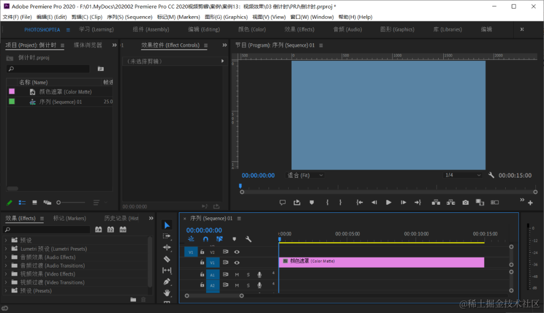 (2)新建颜色遮罩,并拖入到时间轴面板。
