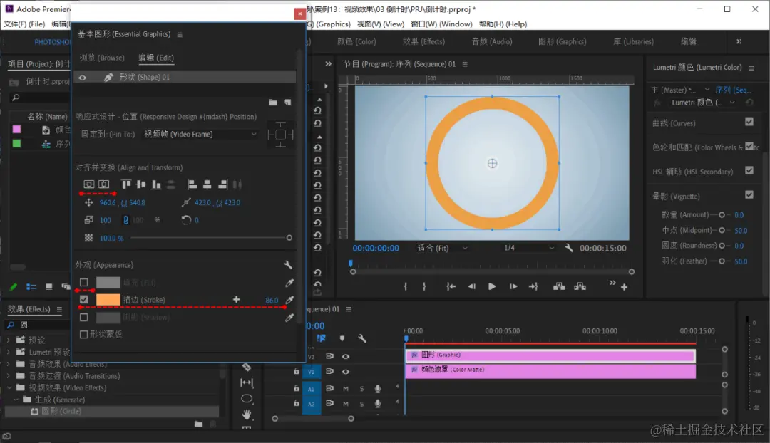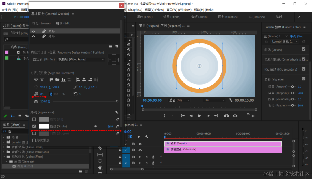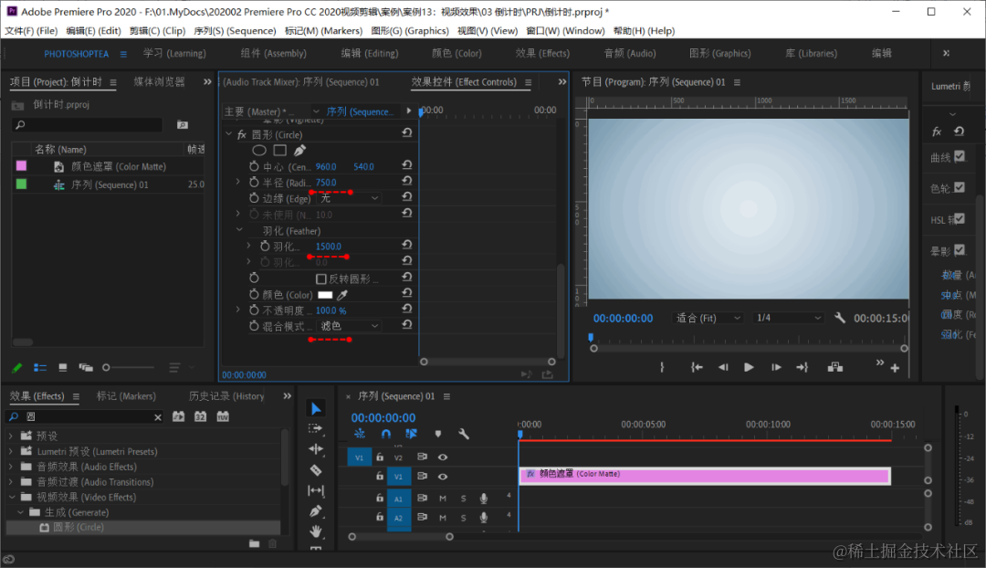 (4)添加视频效果:生成/圆形,并调整相关参数。