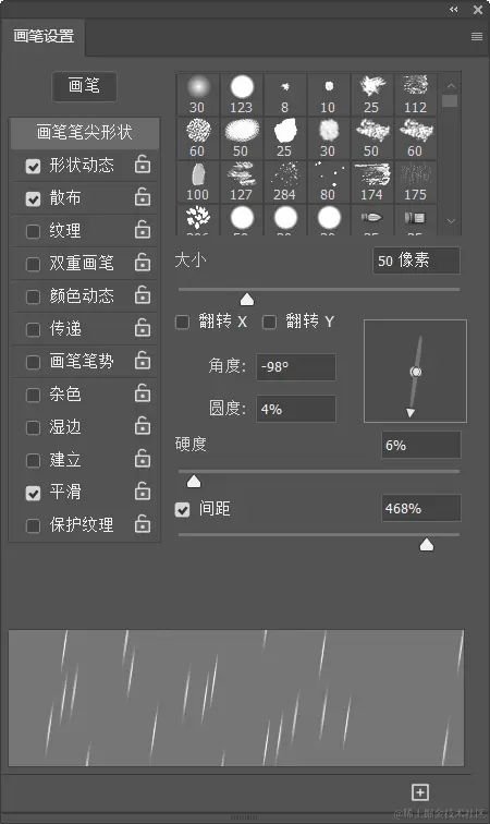 进入画笔设置面板,选择柔边圆画笔,更改“圆度”、“间距”等选项,使之成线条状。然后,设置“形状动态”、“散布”等参数,使之随机分布。