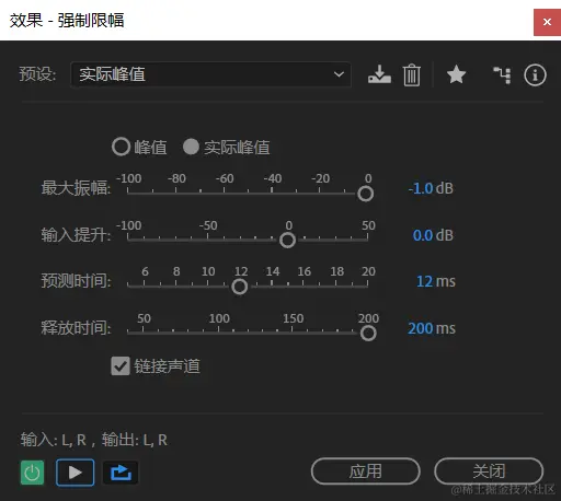 会大幅减弱高于指定阈值的音频。通常,通过输入提升施加限制,也是一种可增强整体音量同时避免扭曲的方法。