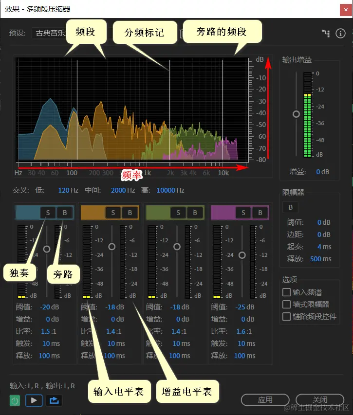 多频段压缩器中的控件可精确地定义分频频率并应用频段特定的压缩设置。要预览隔开的频段,或者用“旁路”按钮绕过频段而不进行处理,请单击“独奏”按钮。在微调各个频段后,勾选“链接频段控制”进行全局调整,然后使用“输出增益”滑块和“限幅器”设置优化整体音量。