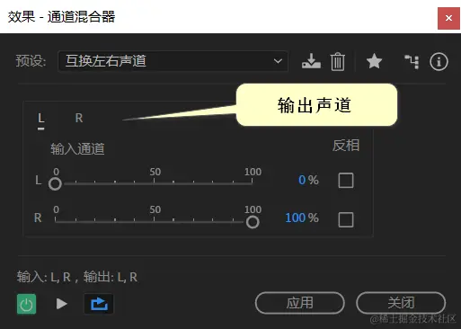 要混合到输出声道,请确定当前声道的百分比。例如,对于立体声文件,L值50和R值50将使输出声道包含相等的分别来自当前左右声道的音频。