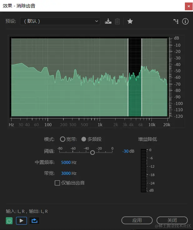 包括:(默认)、4410-6100Hz闪避(Ducking)、4410-7000Hz齿音消除(DeEsser)、减少镲钹声(High-hat)渗出、女声DeSher、女声齿音消除、男声DeSher、男声齿音消除等等。