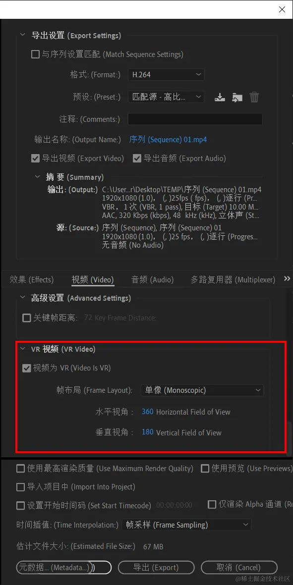 当导出格式设置为 H264、HEVC 或 QuickTime 时,会在导出设置中自动配置剪辑和序列上的VR属性。
