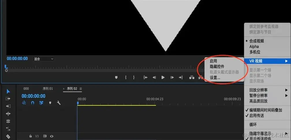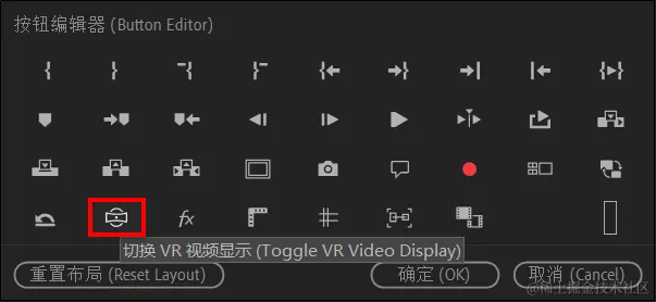 3、 点击时间轴面板右下角的“+”号按钮,找到并启用“切换VR视频显示”,这样就可以在节目监视器中直接看到并可操控VR视频了。