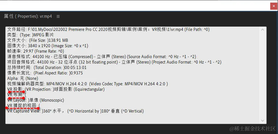 说明:Pr可检测剪辑或序列是否具有VR属性,并相应地自动配置VR查看器。选中项目面板的VR视频素材之后,点击Pr菜单:文件/获取属性/选择。
