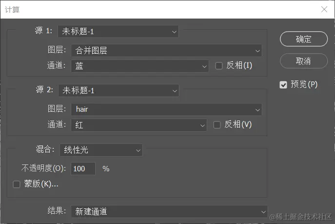 通过通道之间的混合,产生新的对比关系的Alpha通道。最常用的命令是:菜单:图像/计算。