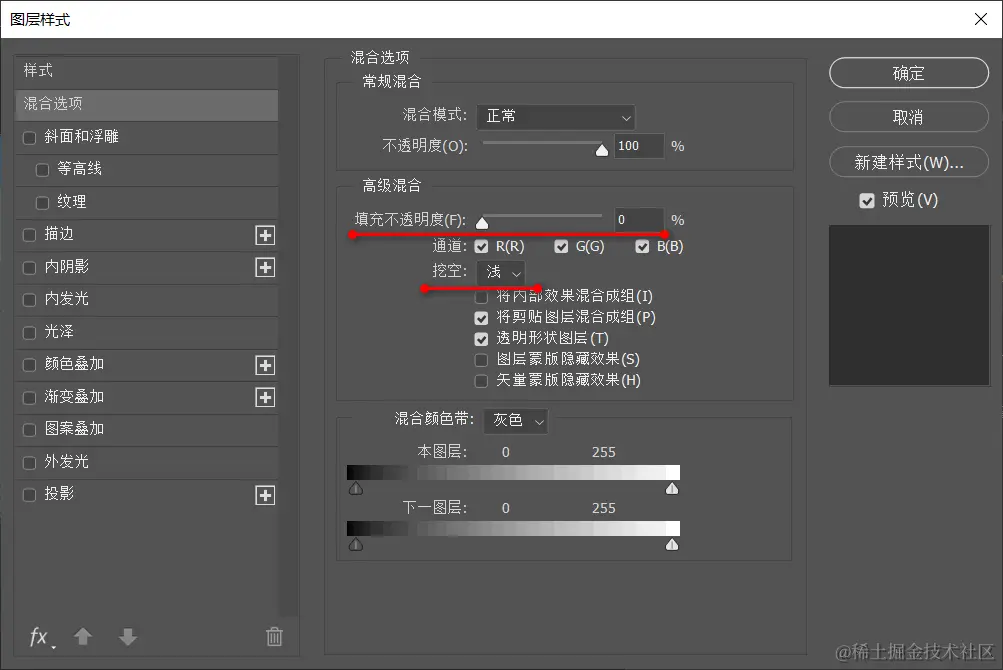 (3)当没有图层组,选择“浅”或选择“深”也无区别,都将挖空至背景图层,如果没有背景图层则挖空至透明。
