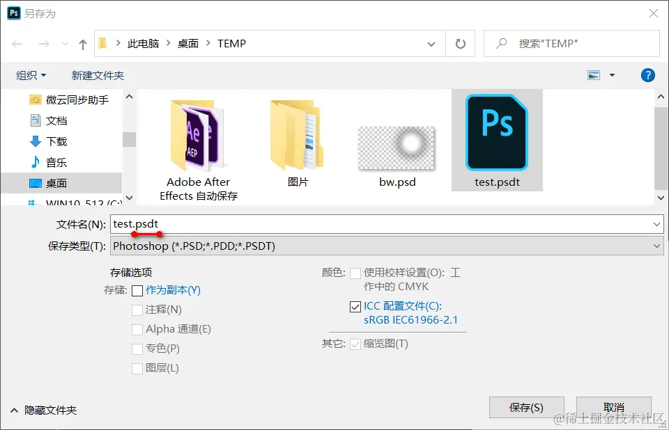 或者,将正在编辑的文档“存储为” .PSDT(如下图,自己手动输入扩展名)。
