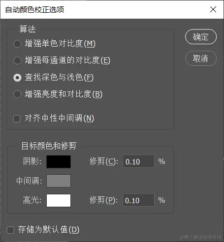 按住 Alt/Opt 键点击曲线命令面板中的“自动”按钮,可选择不同的自动颜色校正算法。