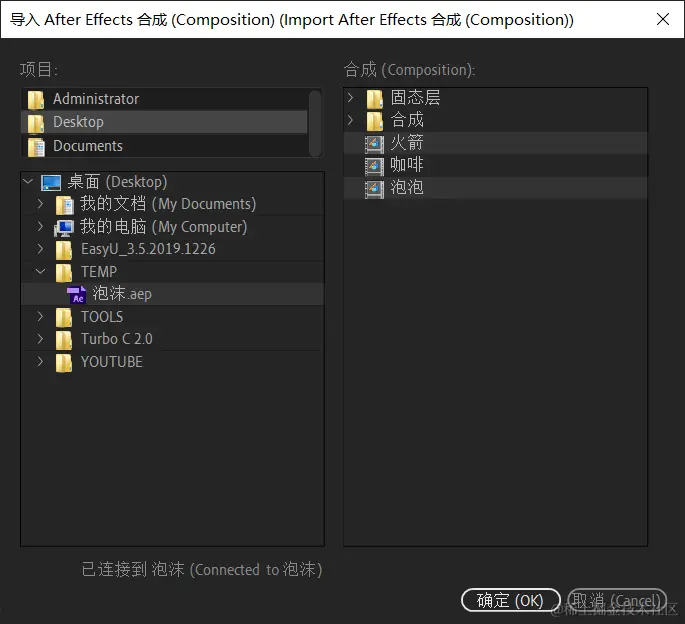 将一个AE项目文件拖到Pr 项目面板中。如果AE项目文件包含多个合成,“导入合成”对话框则会打开。
