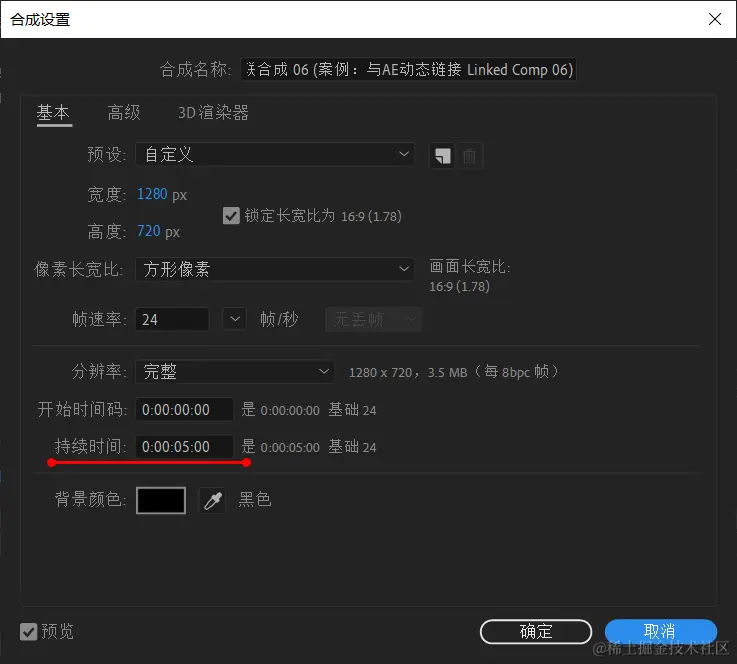 (2)创建AE动态链接合成时,默认合成持续时间设置为 30 秒。要更改持续时间,请在AE中选择该合成,然后选择AE菜单:合成/合成设置。单击“基本”选项卡,然后为“持续时间”指定新值。