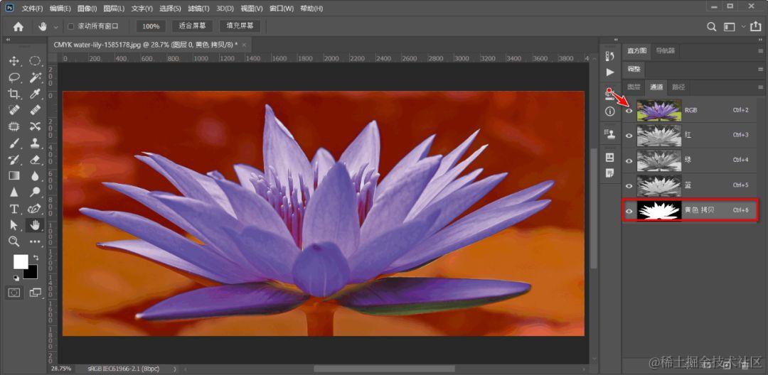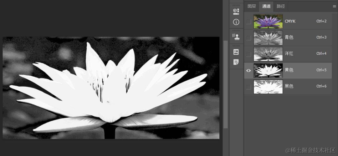 CMYK模式下的原色通道为青色、洋红、黄色和黑色。CMYK是减色模式,原色通道上越白的区域表示该原色的油墨量越少。