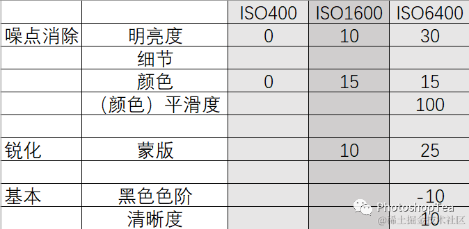 当ISO为400、1600或6400时自动应用不同的设置,参数如下图所示。\