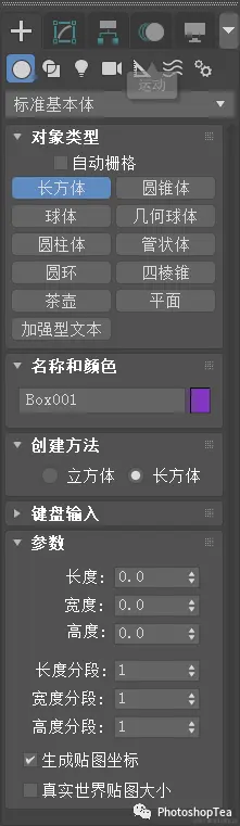 能够创建的基础对象包括:长方体Box、圆锥体Cone、球体Sphere、几何球体GeoSphere、圆柱体Cylinder、管状体Tube、圆环Tonus、四棱体Pyramid、茶壶Teapot、平面Plane、加强型文本TextPlus等等。
