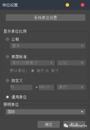 提示: 如果不用考虑贴图大小,可选择“通用单位”,建模时将不显示任何单位。