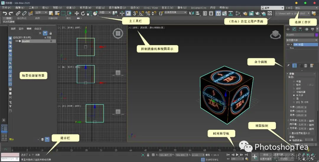 技巧: 切换不同视图窗格时,通常使用鼠标左键点击。如果用鼠标右键点击来切换视图时,会保留选定对象的选取状态。