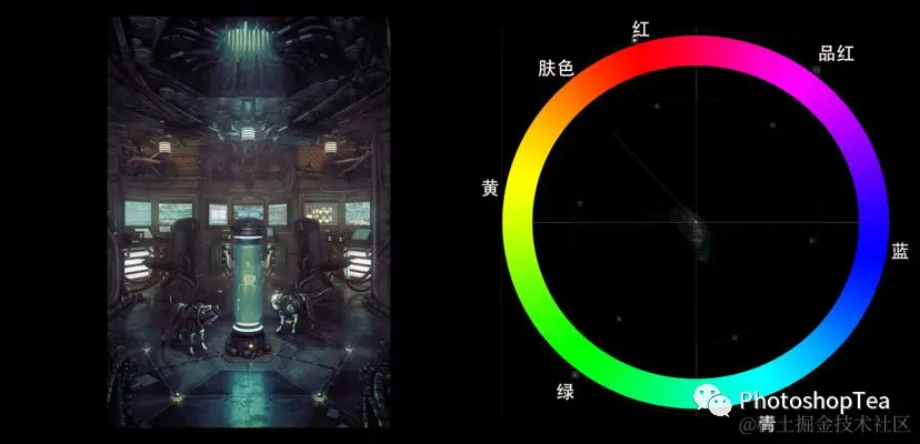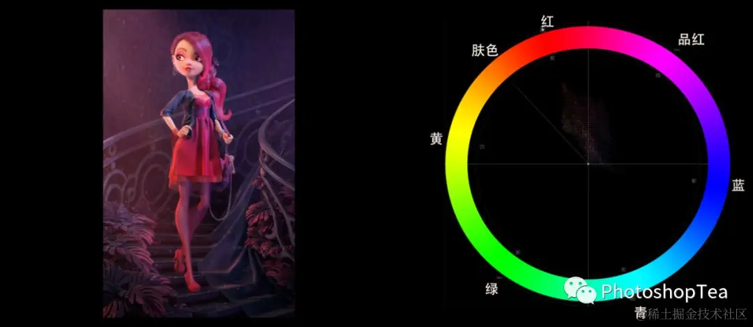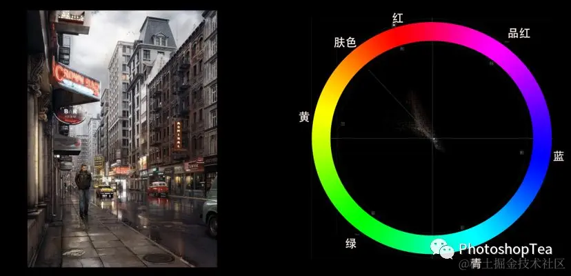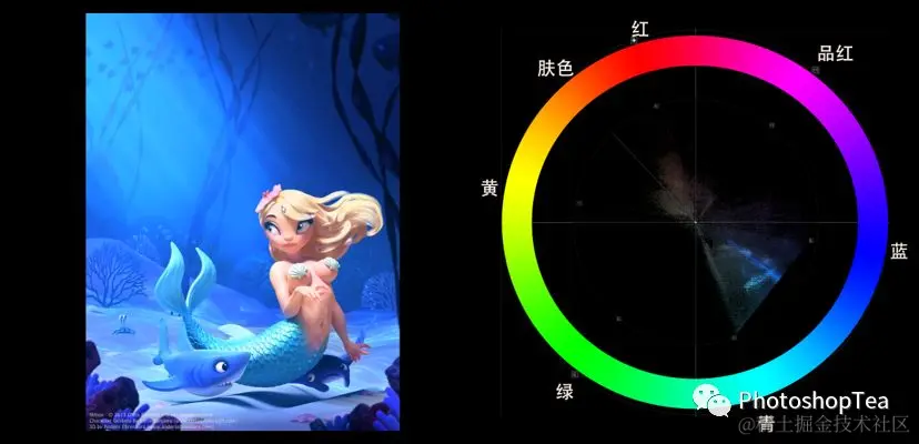 分离互补色(Split Complementary),选择一种颜色,与它的补色在色轮的左侧或右侧的色相进行组合,即可得到分离互补色。在矢量示波器上表现为几何体—等边三角形。