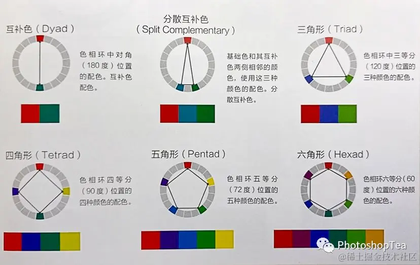 色相环五等分(72度)位置的五种颜色的搭配;