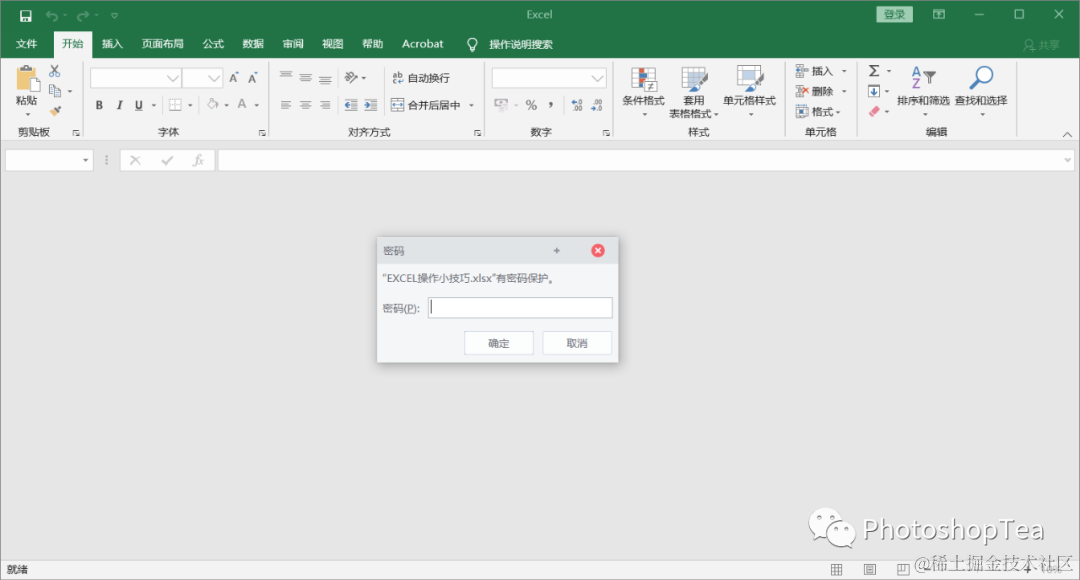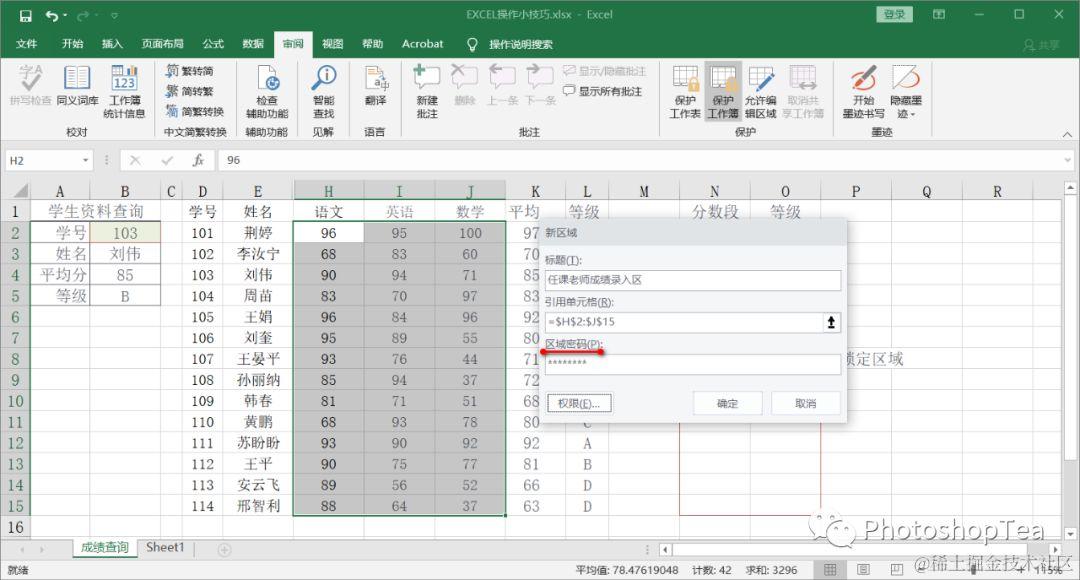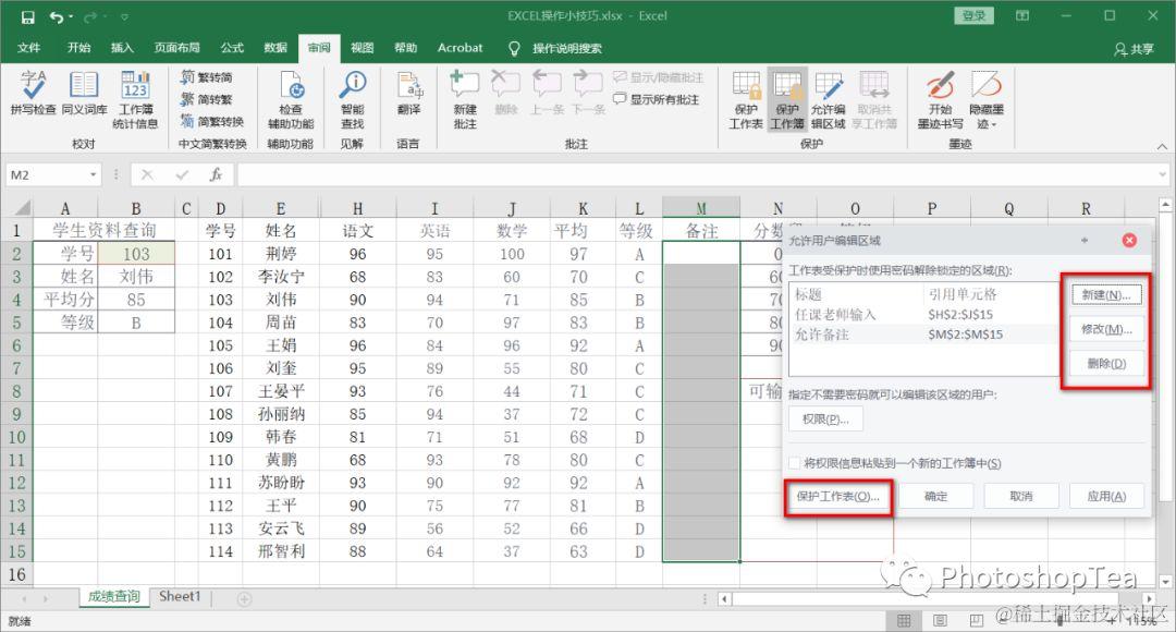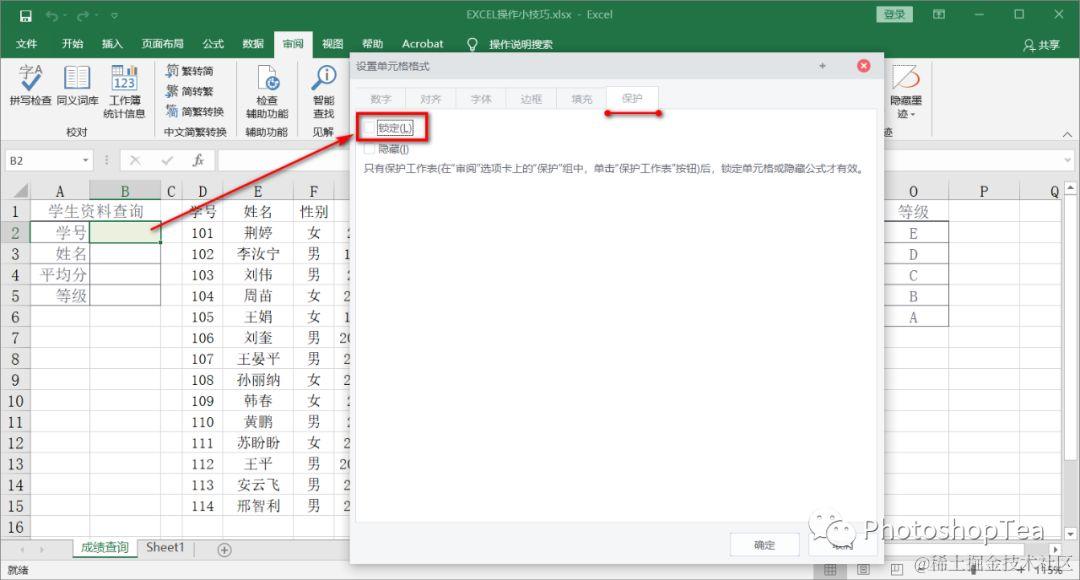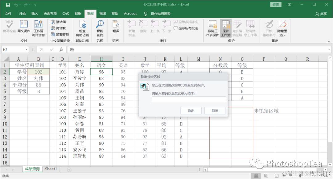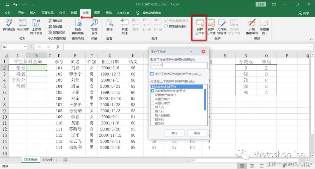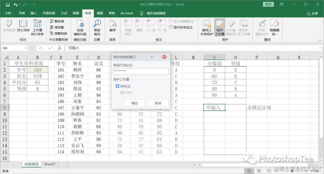 在上述设置完成后,点击审阅选项卡 /保护工作表,两次输入设定密码即可。