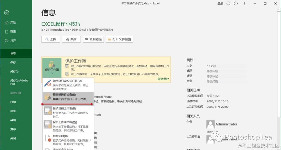 点开“文件选项卡 /信息/保护工作簿”,选择“以密码进行加密”。