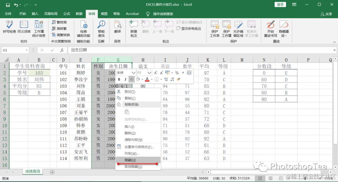 选中某列(行)或工作表标签,右击选择“隐藏”。