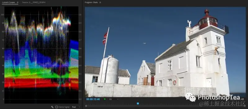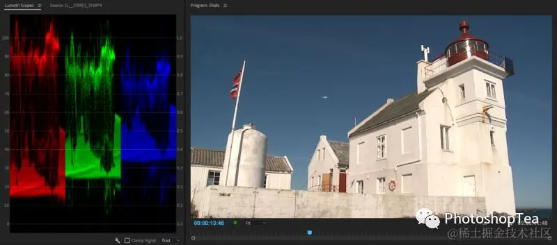 如果我们利用调色工具(如曲线等),使得高光区域的三原色重叠在一起(示波器中呈白色状态),此时,白色建筑物就显得正常多了。\