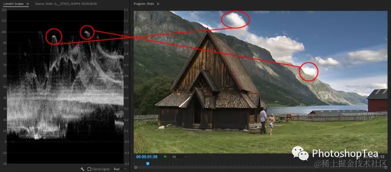 而从波形示波器中可以看出,画面中最亮的白云约在80左右,画面中最暗部在5。所以此画面不论最亮与最暗都没到达0及100。说明画面的对比度与曝光还有可调空间。\