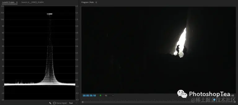 例3: 画面从左到右几乎都在0的位置,即全黑。有中间偏右的位置有亮度,洞口的阳光几乎达到了100。