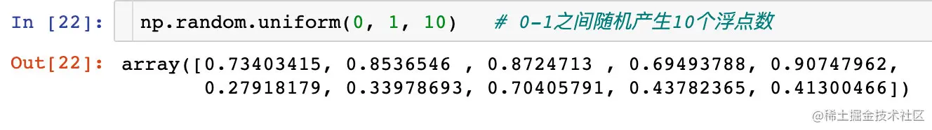 r = np.random.uniform(0, 1, N) # 随机生成0-1之间100000的一个浮点数
