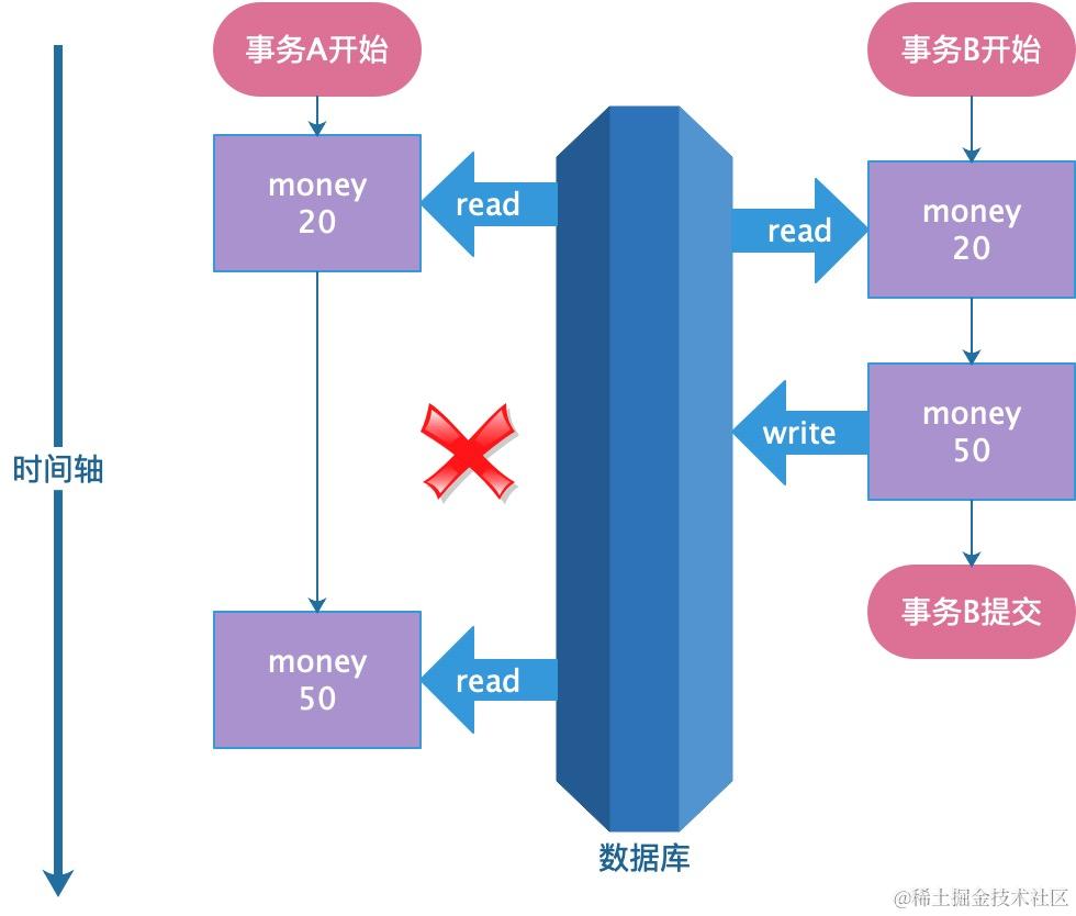 最初数据库中money的值为20,在事务B提交成功后money的值为40,按正常逻辑事务A将money的值减去20,结果应为20,但对事务A来说读取到的值为20,导致最后结果为0。