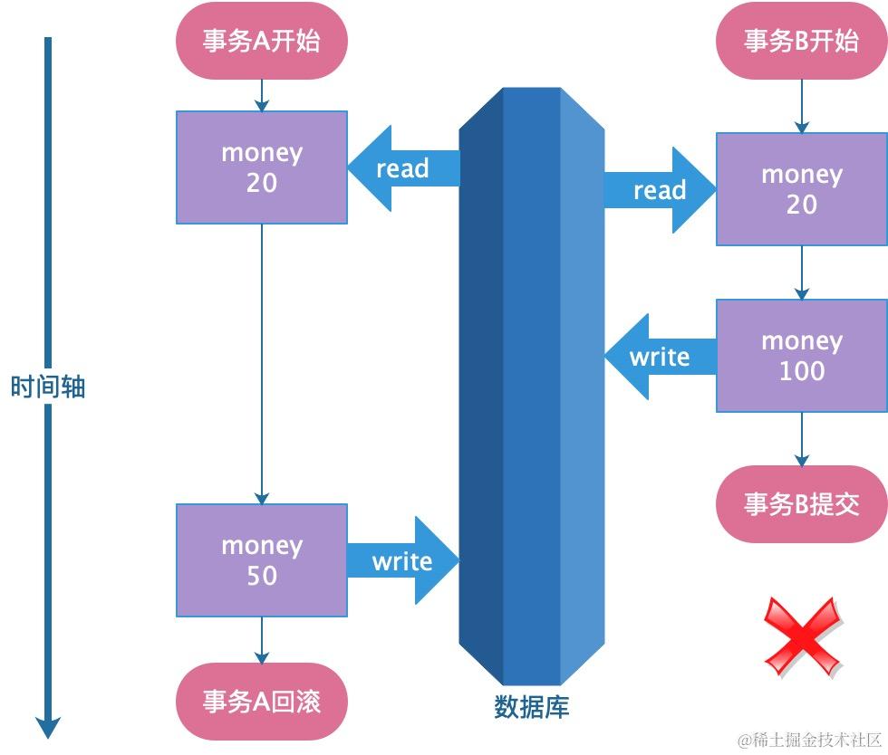 脏写指的是一个事务A一同回滚了另外一个事务B已经提交的数据,这将导致事务B已经执行成功的操作一同被回滚。
