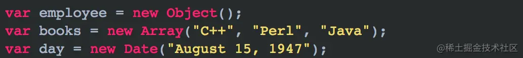 在以下示例中,构造函数方法是Object(),Array()和Date()。这些构造函数是内置的JavaScript函数。