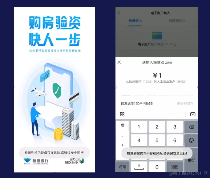 此外,App中集成的恶意Wi-Fi检测功能(WiFiDetect API),可检测Wi-Fi及路由器特征,分析当前尝试访问的网络情况,通过聚类分析,实时反馈Wi-Fi检测结果,帮助App防范来自恶意Wi-Fi的行为攻击。在Wi-Fi网络环境下,当用户使用杭银直销App进行转账时,App调用华为安全检测服务提供的恶意WiFi检测功能,如果检测到Wi-Fi网络环境有风险,App界面上将会提示用户“检测到您的Wi-Fi存在风险,请确保安全运行”,从而减少风险交易的发生。