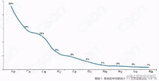 北上广的开发者占全国的38%,江苏、浙江、四川、山东是第二梯队,占比全国总数的24%。月薪超过17k的程序员占21.2%,其中8-17k的占比最高为44.5%。北京月薪17k以上的程序员占比30%,远超其他地区。