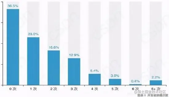 很多人以为互联网有关的从业人员都非常爱跳槽,毕竟跳槽是升职加薪的机会。但数据显示开发者没有跳槽经历的占36.5%,跳槽四次以上的仅11%。