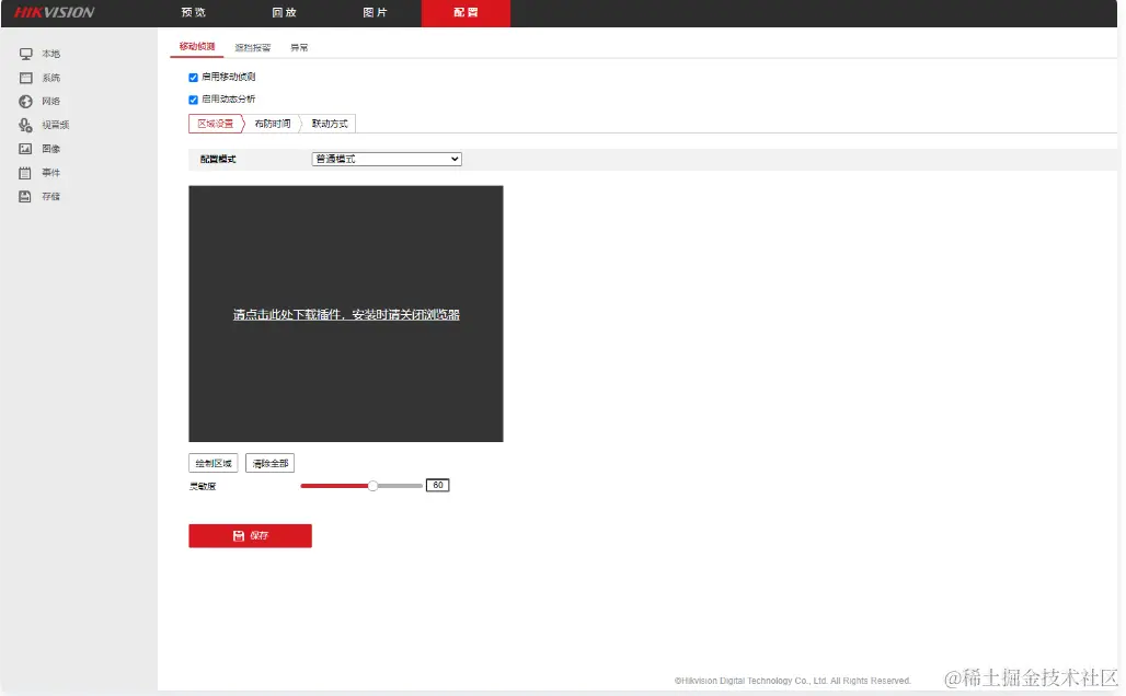 第一步:移动侦测启用、启用动态侦测、灵敏度拉满