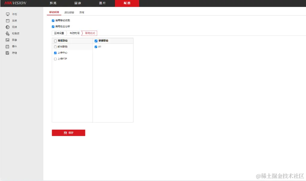 第三步:移动侦测-联动方式设置,选择常规联动(上传中心)-录像联动(AI)